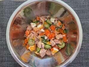 - 玉ねぎの薄切り、茹たまご、油を切ったツナを入れる。